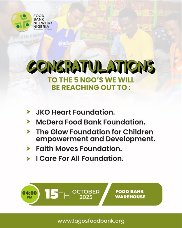 In celebration of World Food Day on Wednesday, 15th June 2025, Food Bank Network Nigeria continued its mission to combat food insecurity by partnering with five non-governmental organizations (NGOs) four based in Lagos and one in Kaduna to distribute essential food items to vulnerable households across Nigeria.