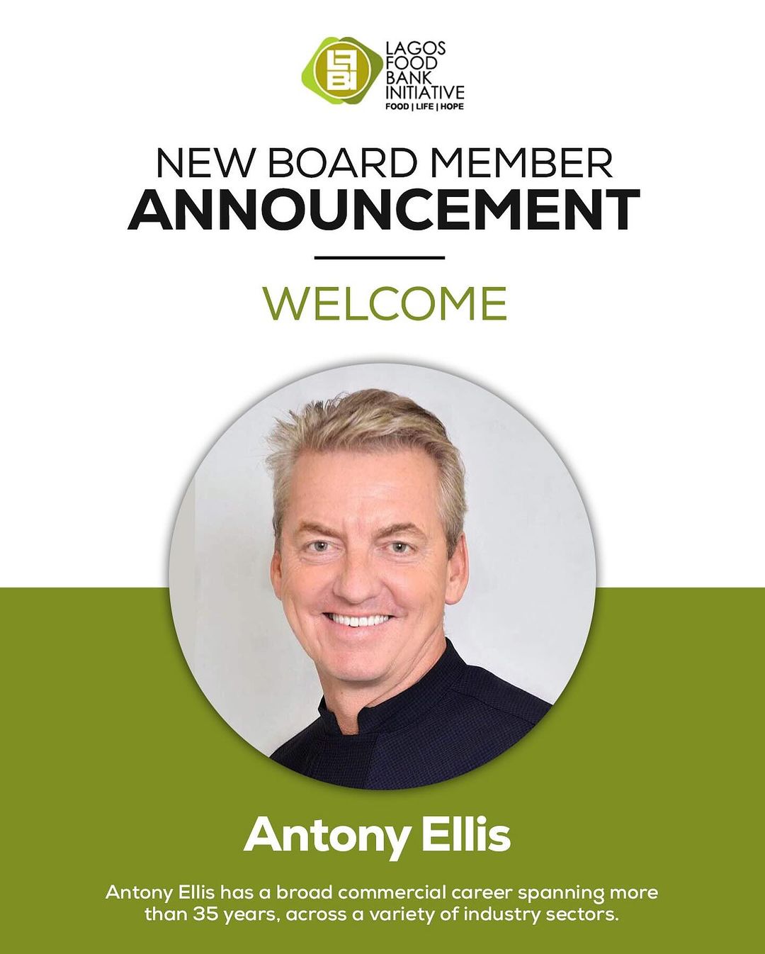 On behalf of the entire governing members of Lagos Food Bank Initiative, we extend our warmest welcome to Mr. Anthony Ellis and look forward to his valuable insights and contributions in advancing our shared goals.