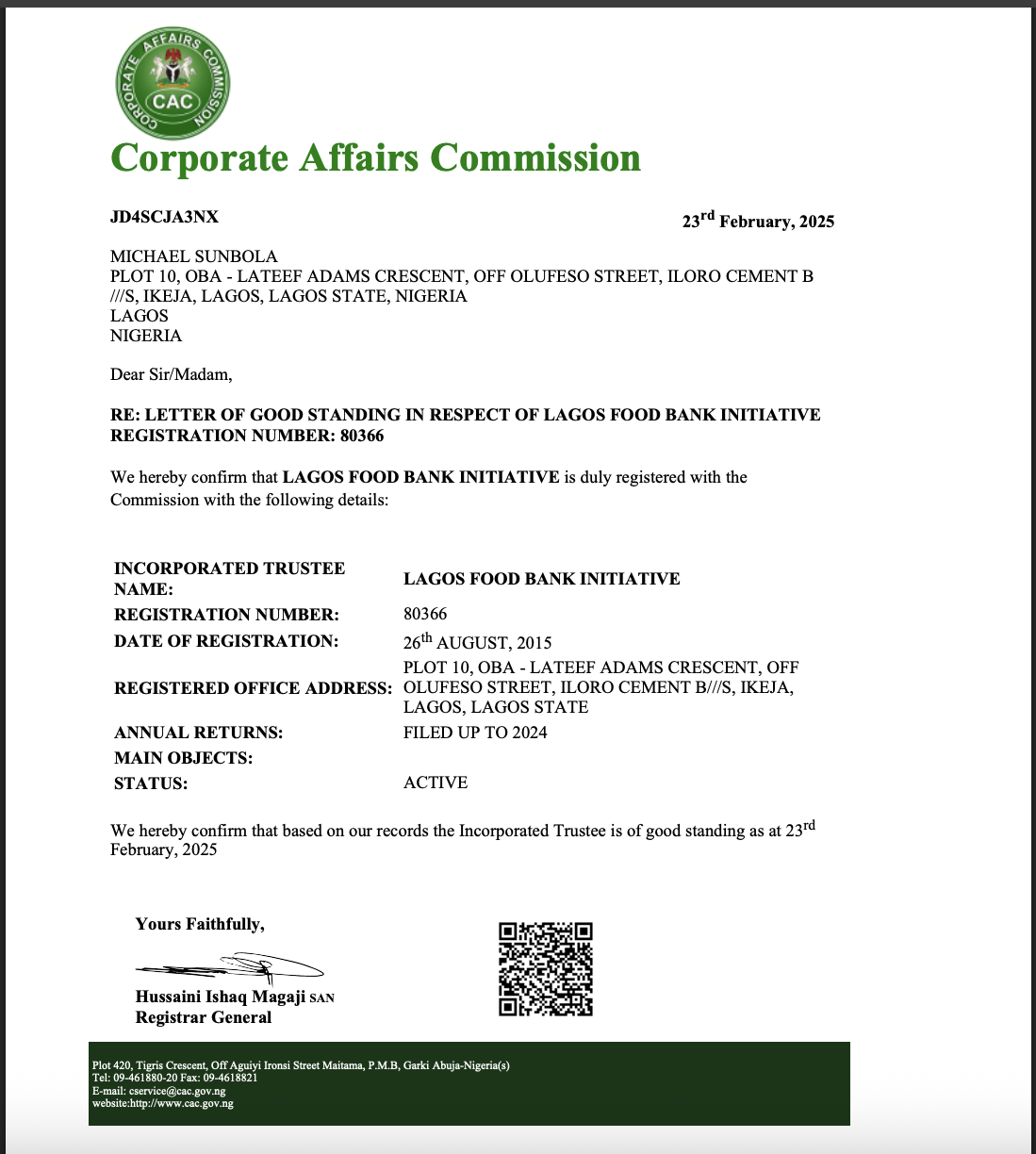 At Lagos Food Bank, we comply with all relevant laws, policies, and regulations required for us to operate as a registered Non-profit organization in Nigeria. We are duly registered with the Corporate Affairs Commissions (CAC) and continuously file our annual returns with them. The pictures below include our CAC certificate of registration, history of annual returns filing, and Special Control Unit Against Money Laundering(SCUML) certificate.